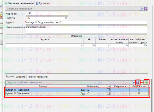 А Точку обліку можна скомпонувати з окремих під’їздів однієї будівлі (вибирати діапазони квартир), на кілька будівель, на під’їзди різних будівель. Для цього в Об’єкті споживання з допомогою кнопки “+” дадати потрібні адреси з діапазонами квартир і натиснути Дискету для збереження: