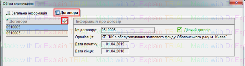 2) Біля об'єкта споживання нажати кнопку "лупа", відкриється вікно "Об'єкт споживання", у цьому вікні перейти на вкладку "Договора"
