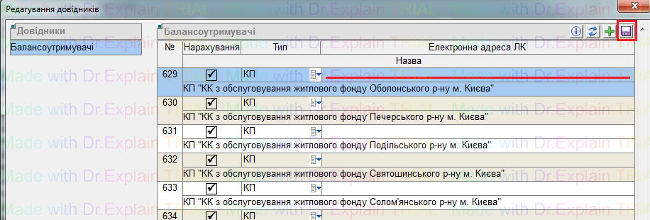5) У вікні "Редагування довідників", у колонці "Електронна адреса ЛК" вказати електронну адресу балансоутримувача і нажати на кнопку "дискета" (зберегти).