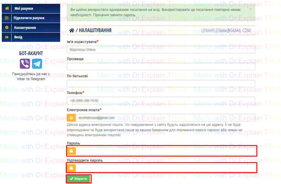 - Вказати пароль у полях "Пароль" та "Підтвердити пароль";