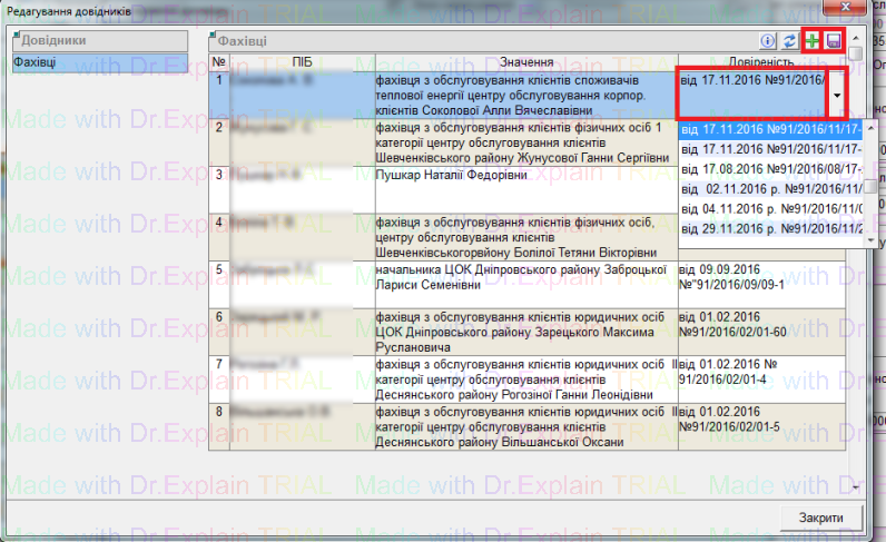 - вибрати потрібного фахівця та натиснути кнопку "дискета"