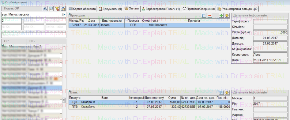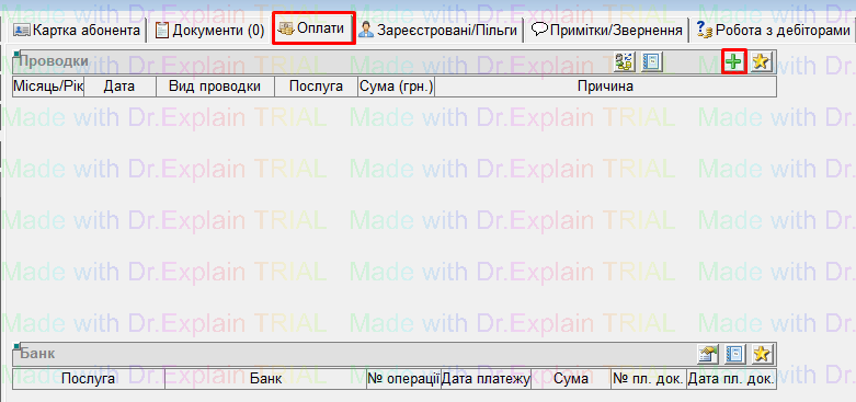 Щоб занести в програму дані по оплатам (проводкам) абонентів, потрібно перейти по вкладкам: