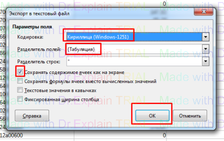 - далі відкриється вікно, у якому у полях “Кодировка” та “Разделитель полей” поставити такі ж значення як на зображенні нижче, та поставити “галочку” біля поля “Сохранять содержимое ячеек как на экране” та натиснути «ОК»