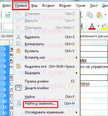2. Далі у цій колонці потрібно замінити “крапки” на “коми”, для цього у меню вибираємо “Правка”, далі вибираємо пункт меню “Найти и заменить”: