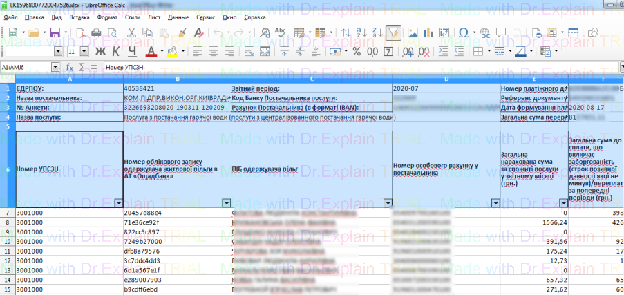 а якщо у колонці G, суми через крапку, тоді потрібно виділити колонку “G” (Сума сплачена за рахунок пільги/субсидії), клацнувши один раз по назві (G) цієї колонки лівою кнопкою миші:
