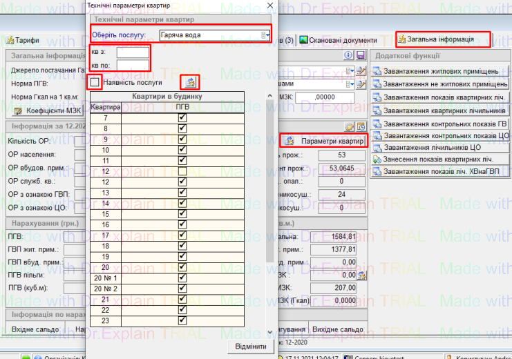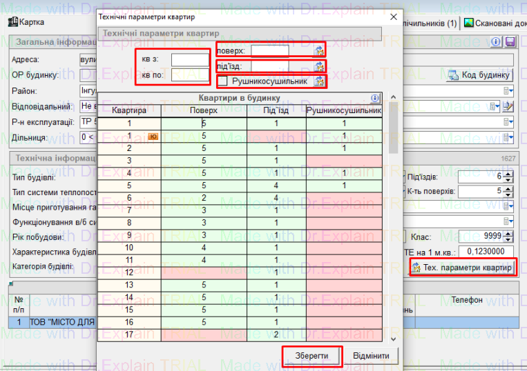 - натиснути “параметри квартир”, відкриється вікно “Технічні параметри квартир”: