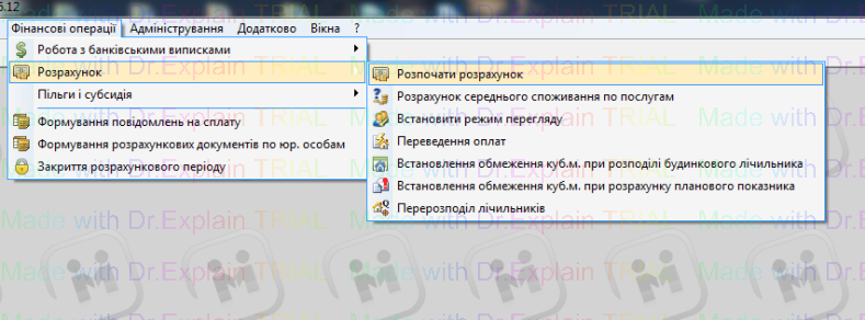Для нарахування по послугам за поточний фінансовий місяць в меню Фінансові операції — Розрахунок, вибираємо пункт — Розпочати розрахунок