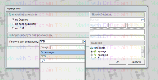 Наприклад, якщо робимо нарахування по будинку, справа у вікні "Пошук будівель" вибираємо адресу і нажимаємо "ОК", після чого нарахування буде зроблене і вікно "Нарахування" автоматично закриється.