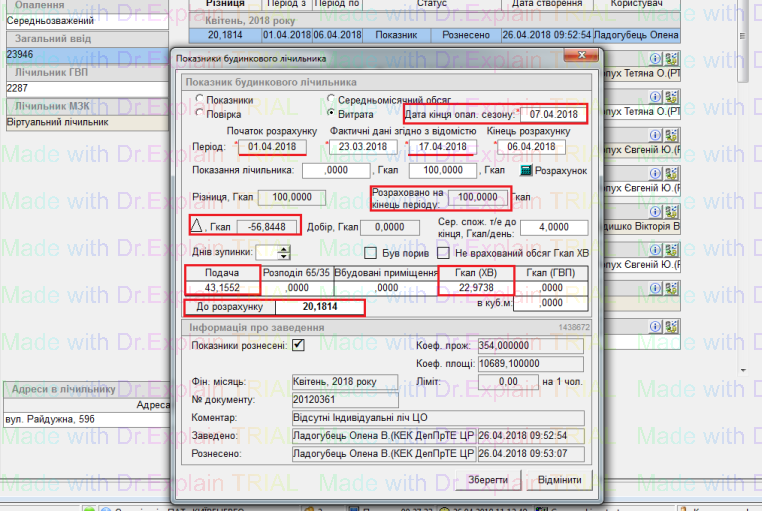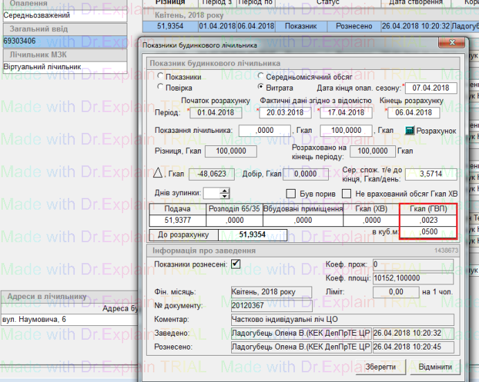 Від показника Заг. вводу віднімаються всі куби, переведені в Гкал, по яким нараховано ГВП, ця величина відображається у полі Гкал(ГВП) (виділено на скріні) після рознесення показника:
