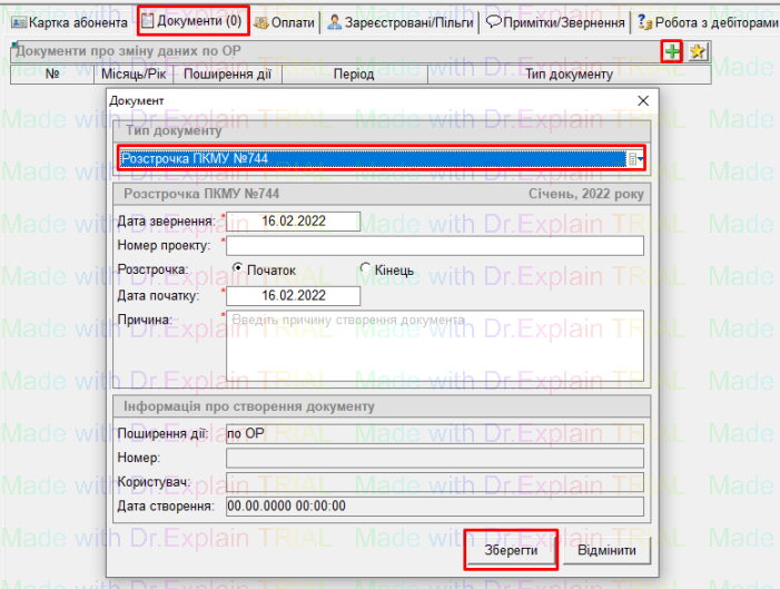 У вікні "Особові рахунки" знайти потрібний ОР, перейти на вкладку "Документи" і натиснути кнопку "+", відкриється вікно “Документ”: