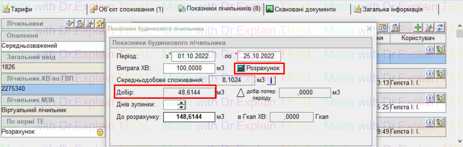 Добір розраховується автоматично при натисненні кнопки розрахунок та при збереженні показників. Алгоритм розрахунок добору такий же як для лічильників ГВ.