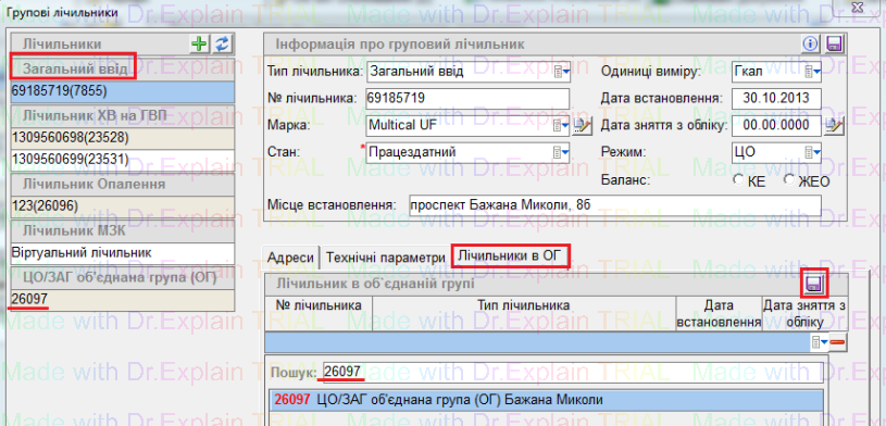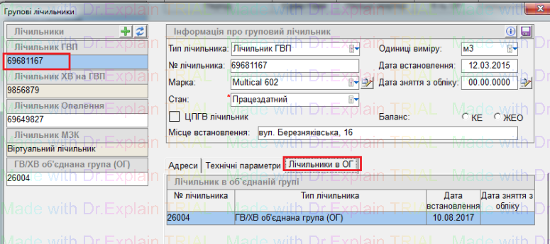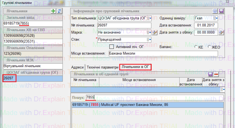 Щоб подивитись, до якого ліч. ОГ прив'язаний підлічильник, вибрати потрібний, у вкладці "Лічильники в ОГ" відображено, до якого Ліч ОГ він прив'язаний: