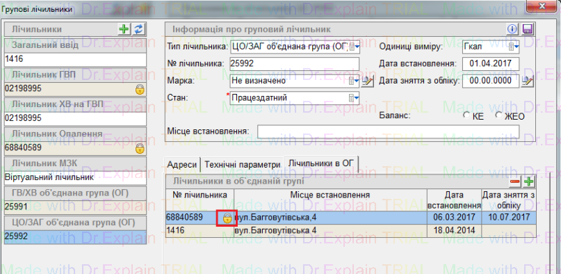 Якщо підлічильник, який входить в ОГ закрили, він буде відображений з замком у вкладці "Лічильники ОГ"