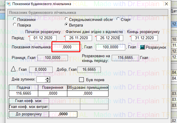 стартовий (попередній) показник автоматично відображено - нуль. Тобто, заводиться тільки споживання по лічильнику, без історії заведення показників: