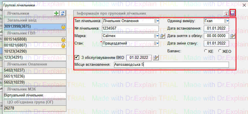 - після заповнення інформації про лічильник натиснути кнопку "дискета" для збереження: