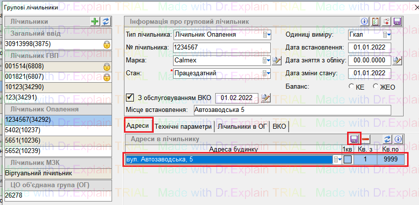 - вибрати Адресу (автоматично підтягується адреса будинку, на якому зараз працюємо), "квартири з... по..", якщо у лічильник входять всі квартири будинку, то залишити автоматично заповнене "з 1 по 9999" і натиснути кнопку "Дискета" для збереження;