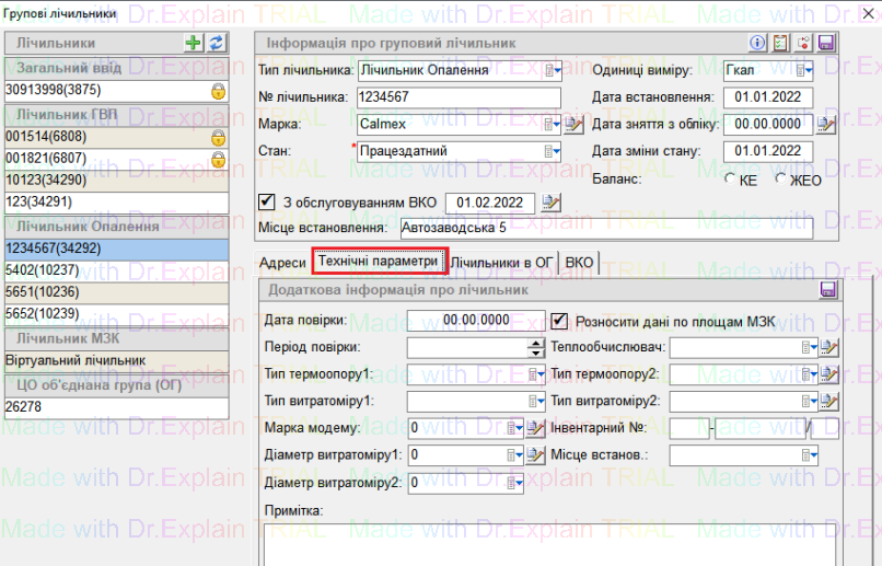 - на вкладці "Технічні параметри" можливо заповнити дані про тех. параметри лічильника:
