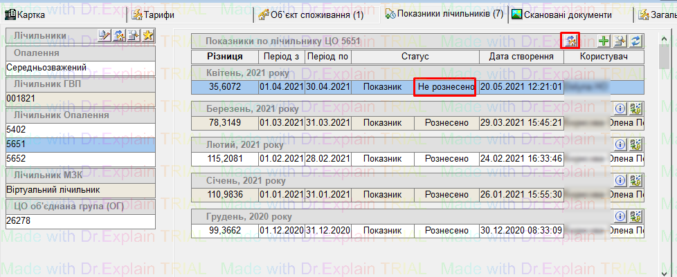 - Після збереження, дані про показник будуть відображені у вкладці "Показники лічильників", статус вказано "Не рознесено" для того, щоб рознести показник, натиснути на кнопку "Будинок зі стрілочкою":