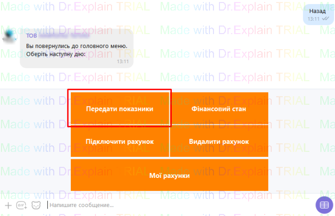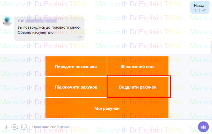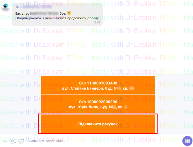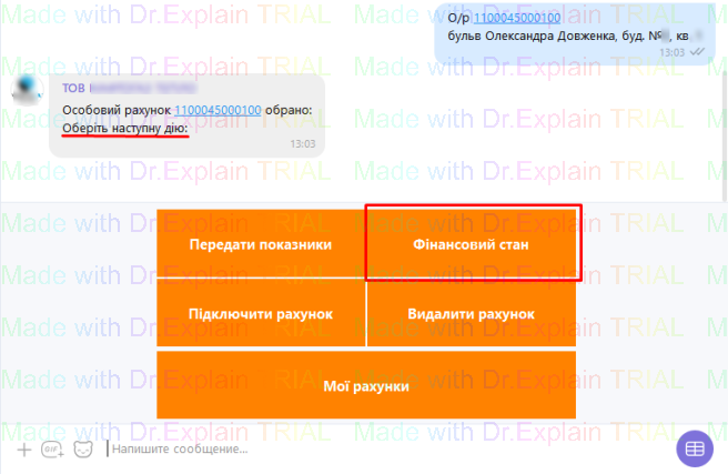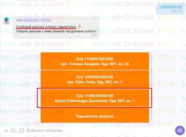 Далі, якщо у Viber - боті підключено кілька особових рахунків, потрібно вибрати ор з яким бажаємо далі працювати: