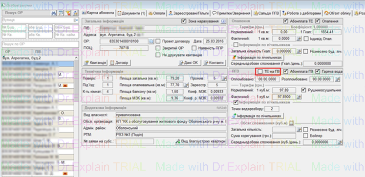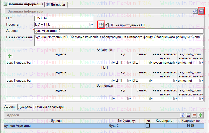 - і на вкладці «Загальна інформація», біля поля «ТЕ на приготування ГВ» натиснути кнопку «листок з ручкою» для встановлення або зняття даної відмітки, після цього натиснути «дискету» для збереження змін,