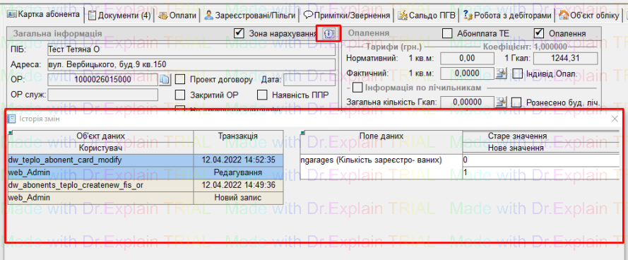 Щоб переглянути історію змін по особовому рахунку, у картці потрібного ОР натиснути кнопку "і", відкриється вікно "Історія змін":