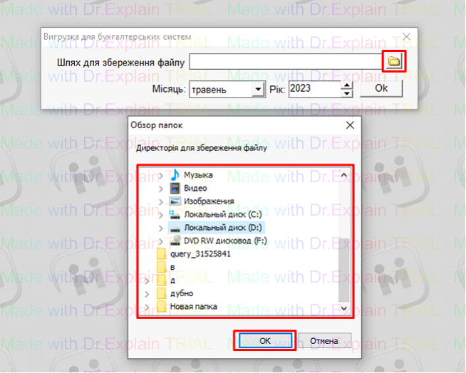 3. Натиснути кнопку «папка», та вибрати у яку папку потрібно вивантажити сформований файл: