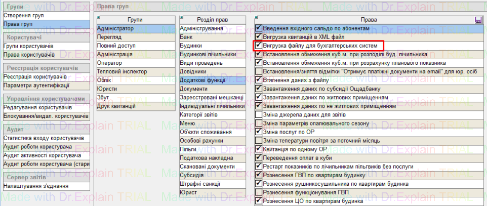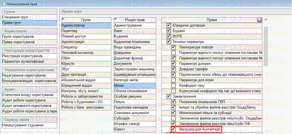 - і активувати право «Вигрузка для бухгалтерії»: