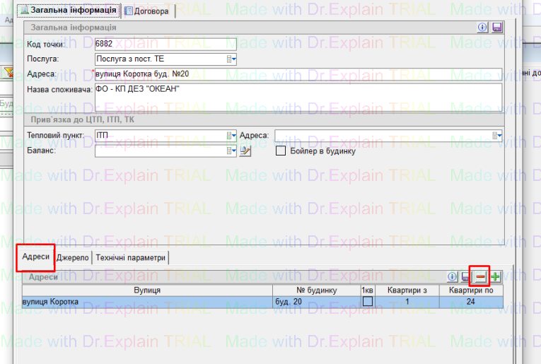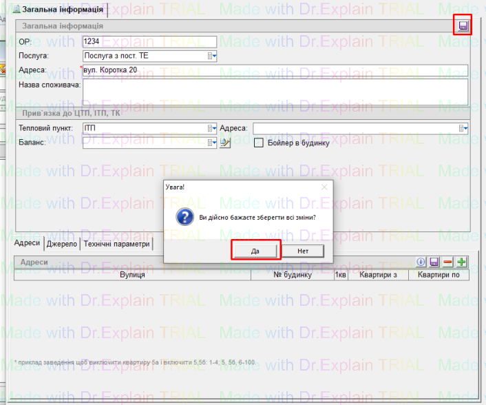 - Видалити на вкладці “Адреси” поточну прив’язку, і натиснути “дискету” для збереження: