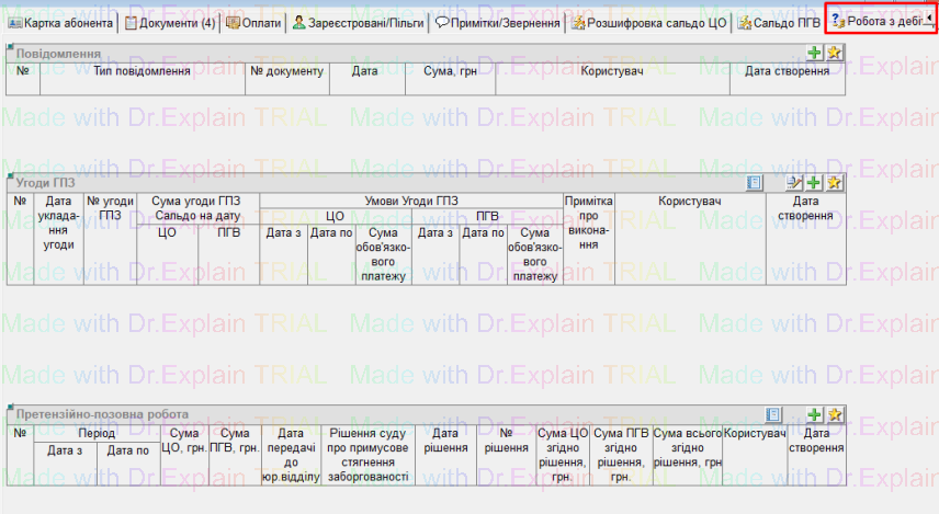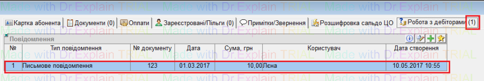 Після збереження, автоматично до такого запису додається інформація про користувача, який додав запис та дата створення запису; біля назви вкладки "Робота з дебіторами" буде візуалізація з відміткою про наявність повідомлення (і к-сть створених повідомлень)