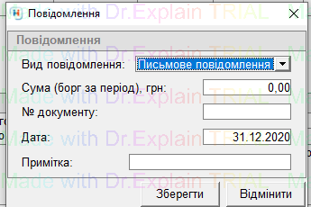 - Вибрати Вид повідомлення (Письмове повідомлення/ SMS/ Автодозвон Бесіданаживо Претензія Вимога)