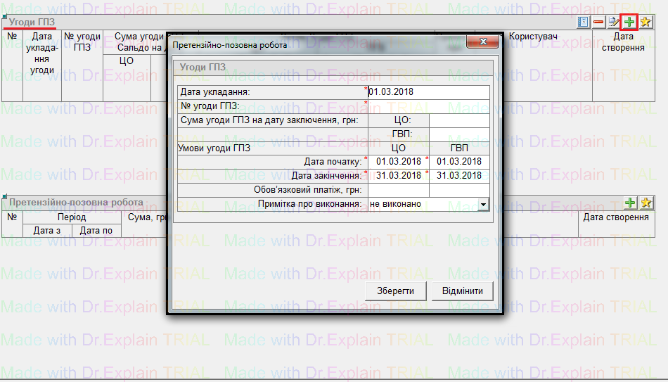 - у блоці "Претензійно - позовна робота" нажати кнопку "+", відкриється вікно для створення ППР