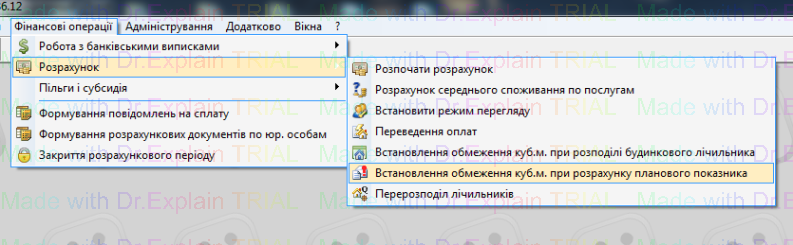 Для того, щоб "встановити обмеження куб.м при розрахунку планового показника", у меню: Фінансові операції — Розрахунок - Встановлення обмеження куб.м при розрахунку планового показника: