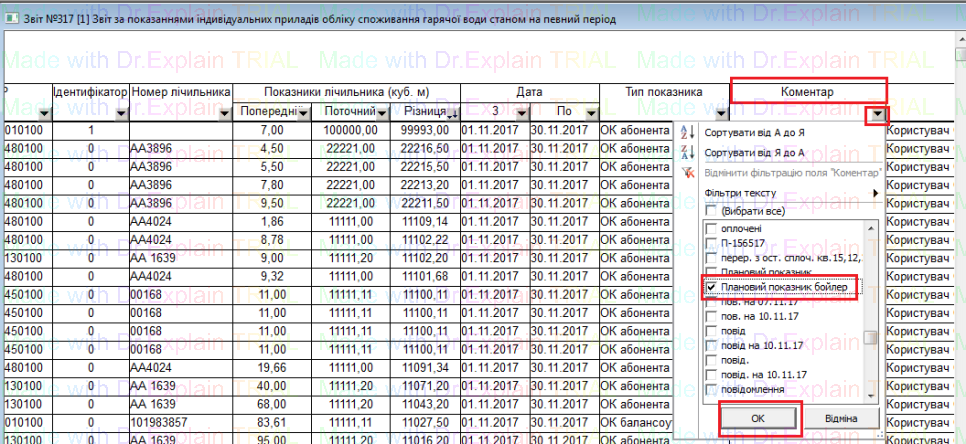Для того, щоб подивитись по яким особовим рахункам рознісся показник по бойлерам, потрібно побудувати звіт 317, у колонці "Коментар" вибрати фільтр "Плановий показник бойлер" і буде відображений звіт з особовими рахунками, по яким був рознесений плановий показник по бойлеру.