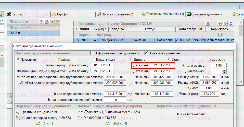 Але якщо б, наприклад, по лічильнику «Дата кінця» була б внесена не по 24 03 2023, а наприклад по 25 03 2023, — тоді нарахування по показнику було б включно по 25те число :