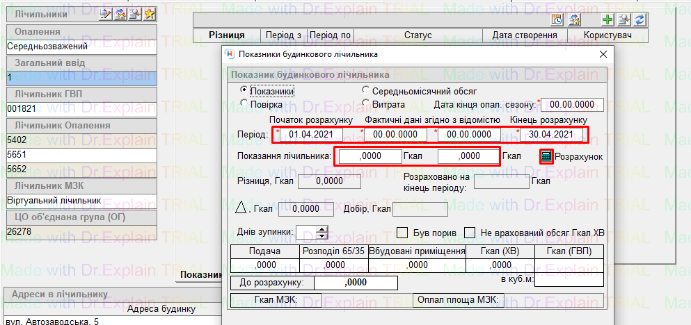 У вікні "Показники будинкового лічильника" заповнити Період, показники лічильника (з.. та по..), нажати кнопку "розрахунок", після чого автоматично розрахуються остальні дані; та нажати Зберегти. Різниця підрахується автоматично