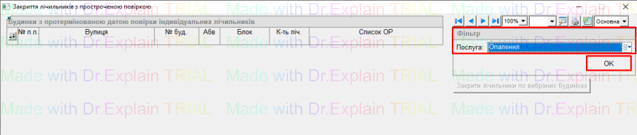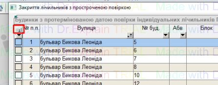 якщо по всьому сформованому списку потрібно закрити такі індивідуальні лічильники з простроченою або відсутньою повіркою, тоді натиснути кнопку “Закрити лічильники по обраних будинках”;