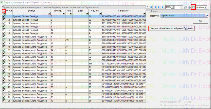 потім проставити галочки тільки біля потрібних будинків, і натиснути кнопку “Закрити лічильники по обраних будинках”;