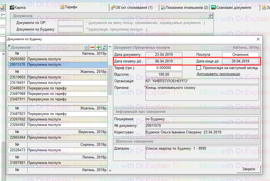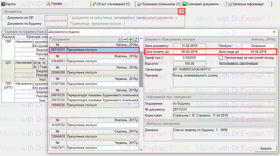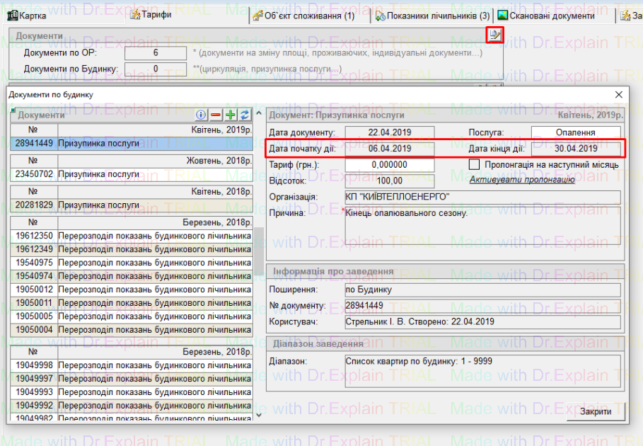 заносимо показники 05.04.2019 (05.04.2019 — послуга надається, 06.04.2019 — послуга вже відсутня)