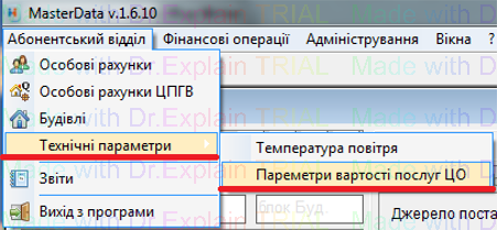 Потрібно відкрити даний пункт меню → "Абонентський відділ" → "Технічні параметри" → "Параметри вартості послуг ЦО"