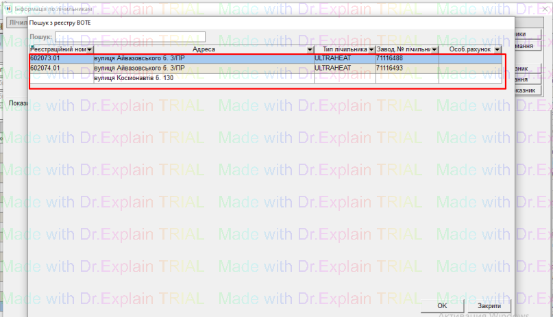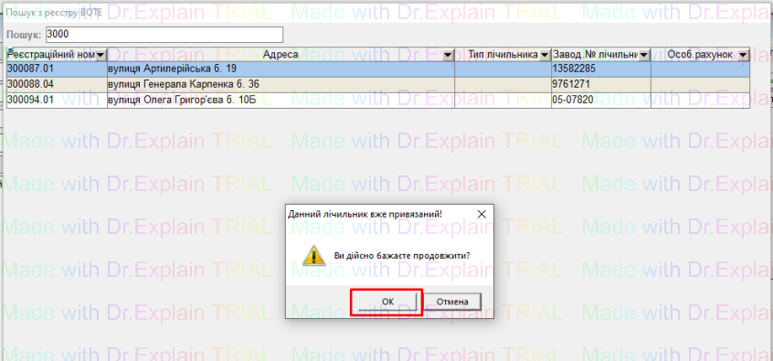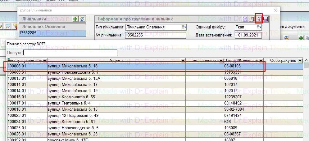 А для зміни прив’язки будинкового лічильника з реєстром, натиснути на кнопку “біла і червона крапка”, вибрати потрібний лічильник з списку, двічі клацнувши по ньому, і буде відображена нова прив’язка: