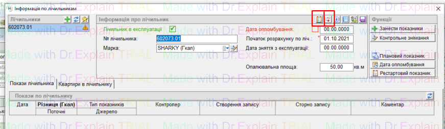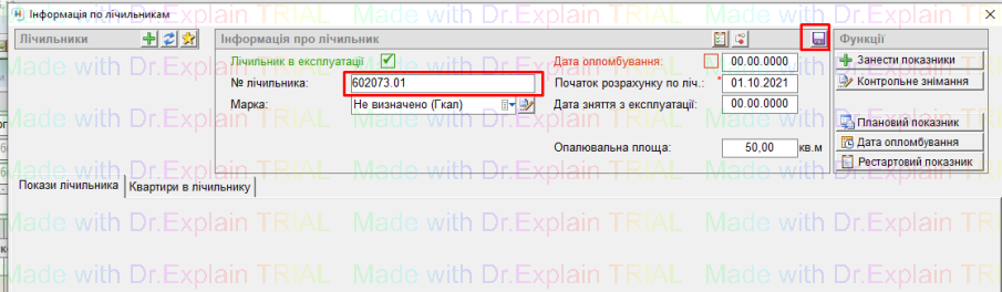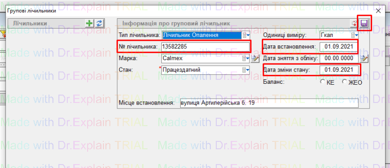 - після цього номер вибраного лічильника підтягнеться у поле “№ лічильника”, далі заповнити інформацію про лічильник, і зберегти “дискетою”: