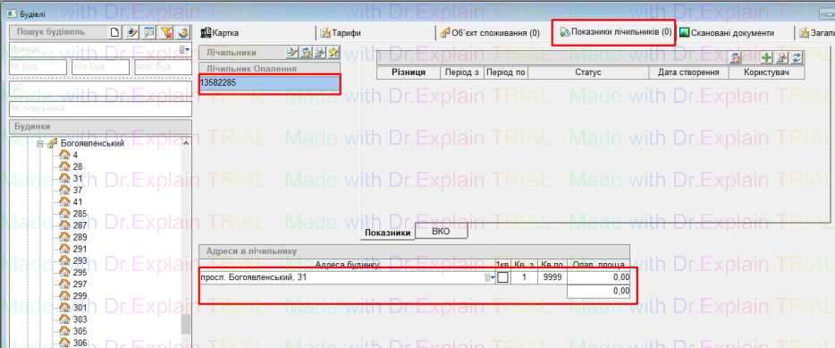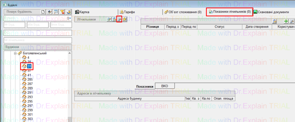 - відкрити потрібний будинок, перейти на вкладку “Показники лічильників”, і натиснути кнопку “лупа”: