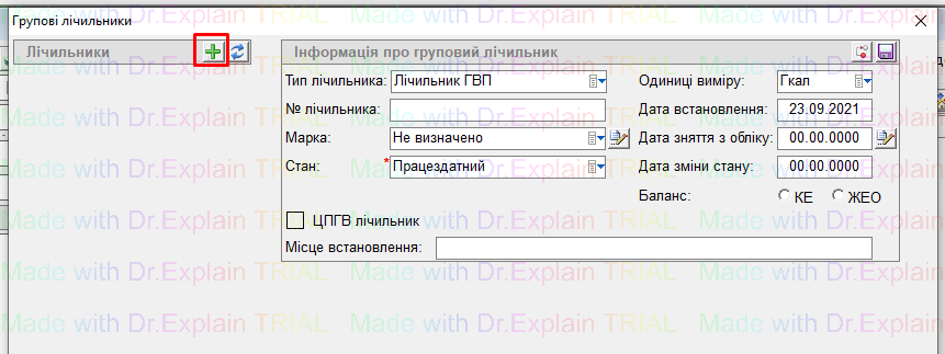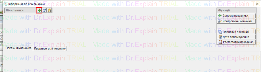 - відкриється вікно “Інформація по лічильникам”, для заведення нового лічильника натиснути “+”: