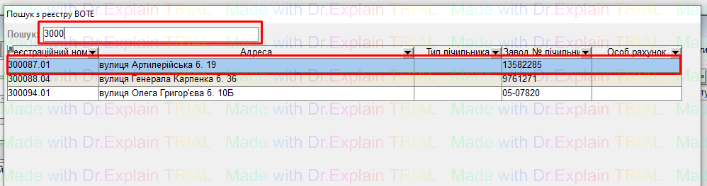 - відкриється вікно “Пошук реєстру ВОТЕ”. У цьому вікні у поле “Пошук” почати вводити реєстраційний номер потрібного лічильника з журналу, і буде відображено список лічильників з введеними значеннями у пошуку; далі двічі клацнути лівою кнопкою миші по потрібному лічильнику: