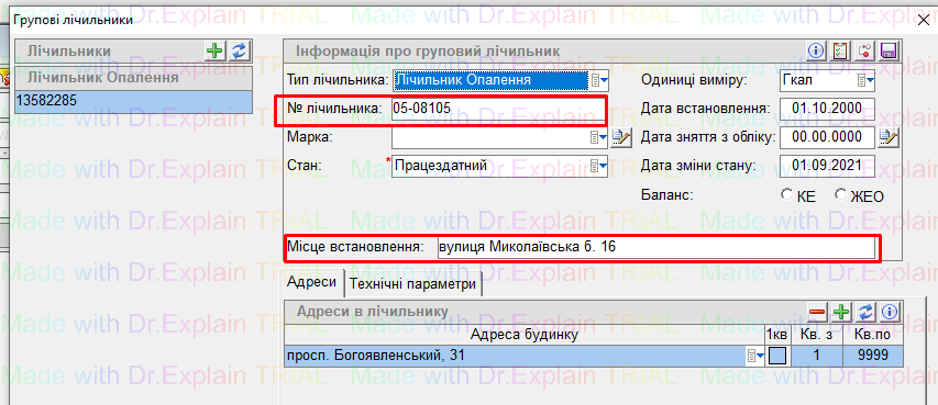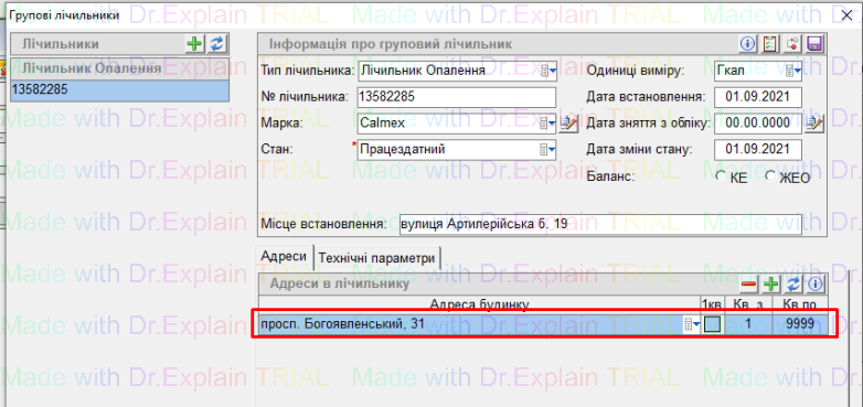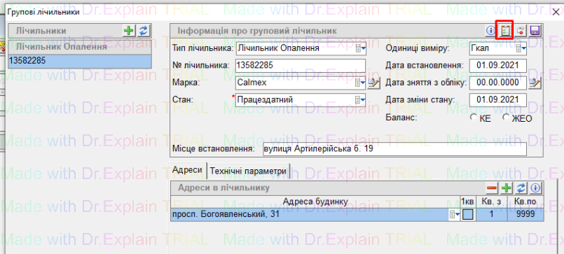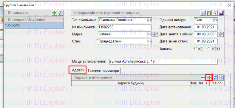 - після збереження, потрібно прив’язати лічильник до будинку - для цього, на вкладці “Адреси” натиснути кнопку “+”, автоматичо підтягнеться будинок на якому ми працюємо, і натиснути “дискету” для збереження: