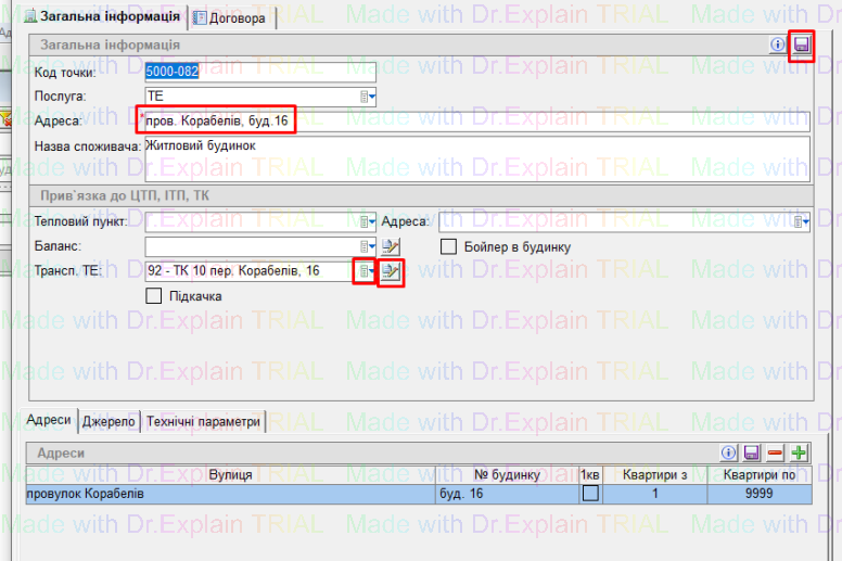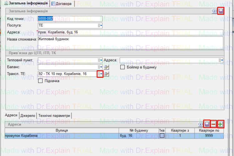- знизу, на вкладці “Адреси”, видалити поточну прив’язку будинку кнопкою “-”,