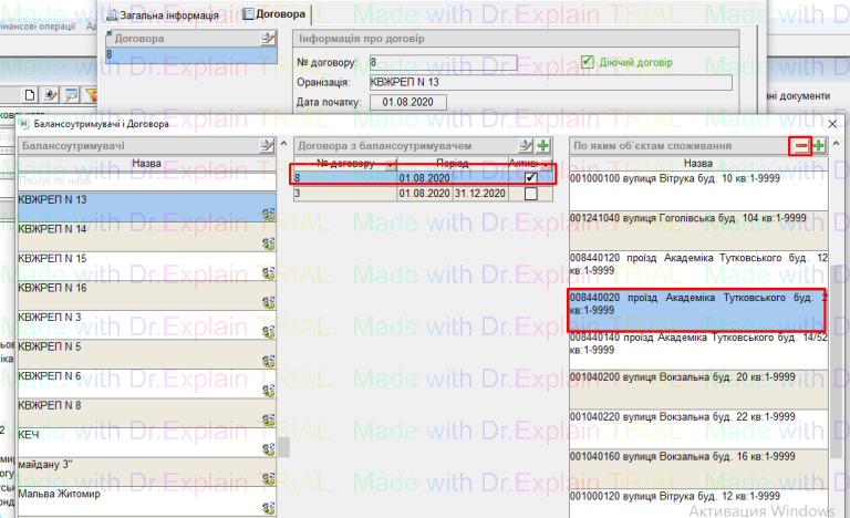 - далі вибираємо активний договір, у колонці "По яким об'єктам споживання" вибираємо будинок "Академіка Тутковського 2" та нажимаємо кнопку "-" (видалити):