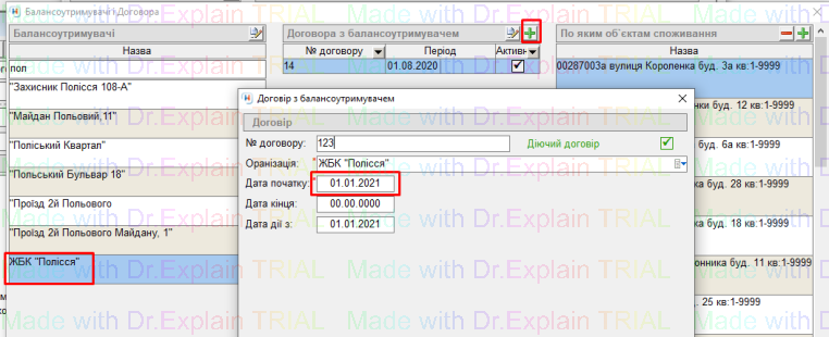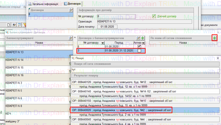 - далі у договір який ми створили з 01.08.2020 по 31.12.2020, додаємо будинок "Академіка Тутковського2" двічі клацнувши мишкою по ньому: