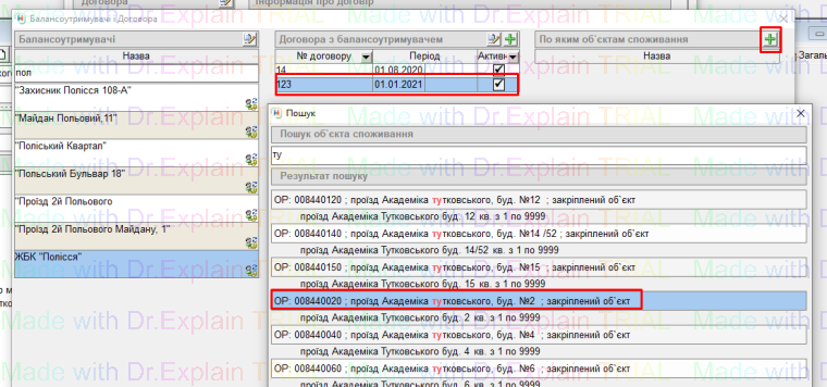 - далі до цього договору, у колонці "По яким об'єктам споживання" нажимаємо "+", та прив'язуємо будинок Академіка Тутковського 2