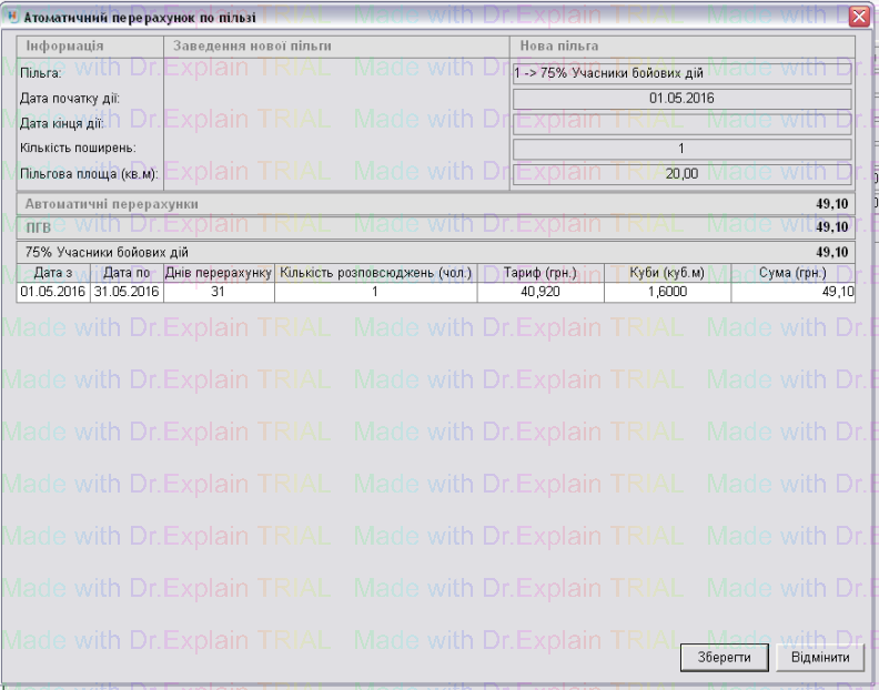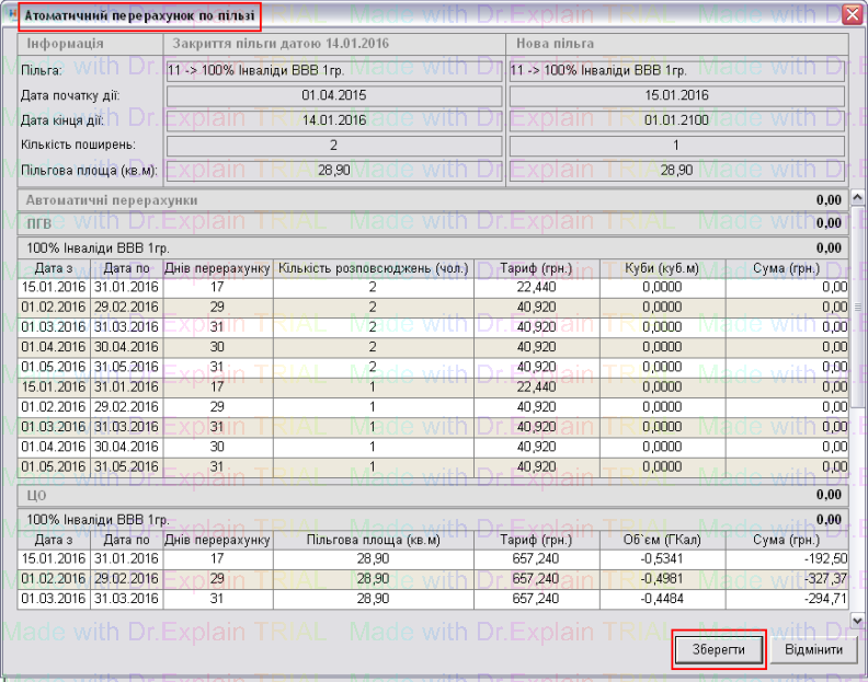 Для того щоб змінити "дату початку дії" або "дату кінця дії" існуючої пільги, нажати на пільгу подвійним кліком миші, зробити потрібні зміни, нажати Зберегти, і програма запропонує автоматичний перерахунок по пільзі, нажати Зберегти.
